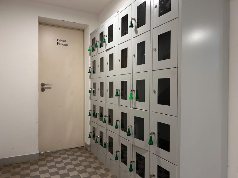 A cloakroom and lockers are located in the basement and can be reached via the stairs. If the basement is not accessible or difficult for you to access, you can leave your coat and valuables at the ticket office.