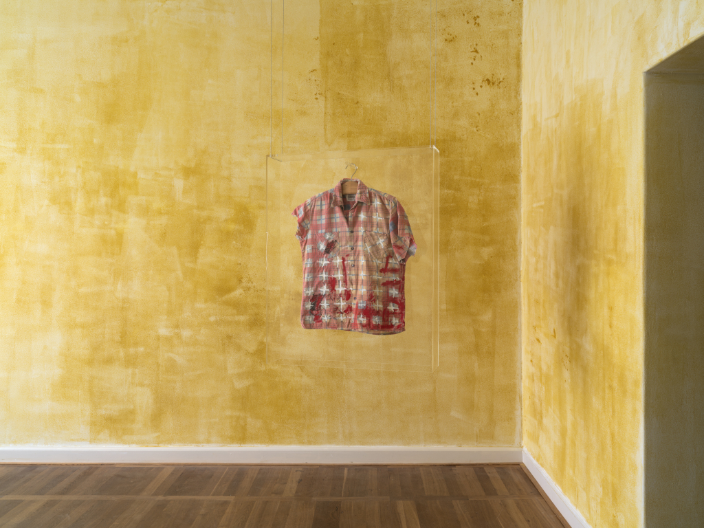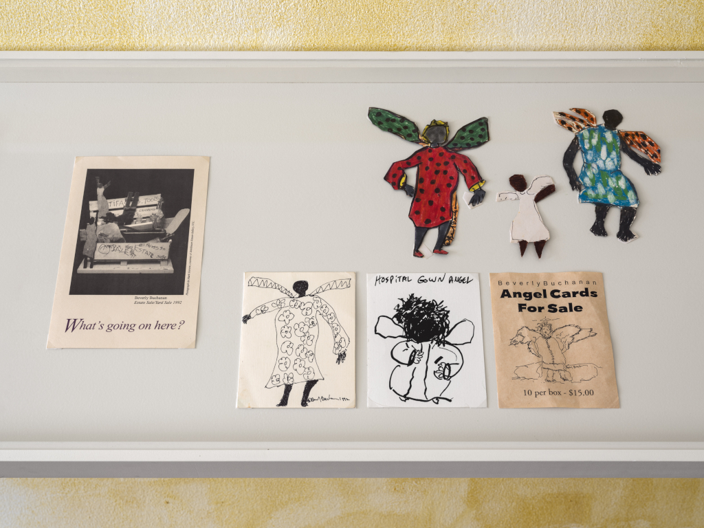 Mitte: Beverly Buchanan, Church on Fire, 1997, Hintergrund: Ima-Abasi Okon, Sex, 2025, Installationsansicht Beverly Buchanan. Weathering mit Ima-Abasi Okon, Haus am Waldsee, 2025, Foto: Julian Blum